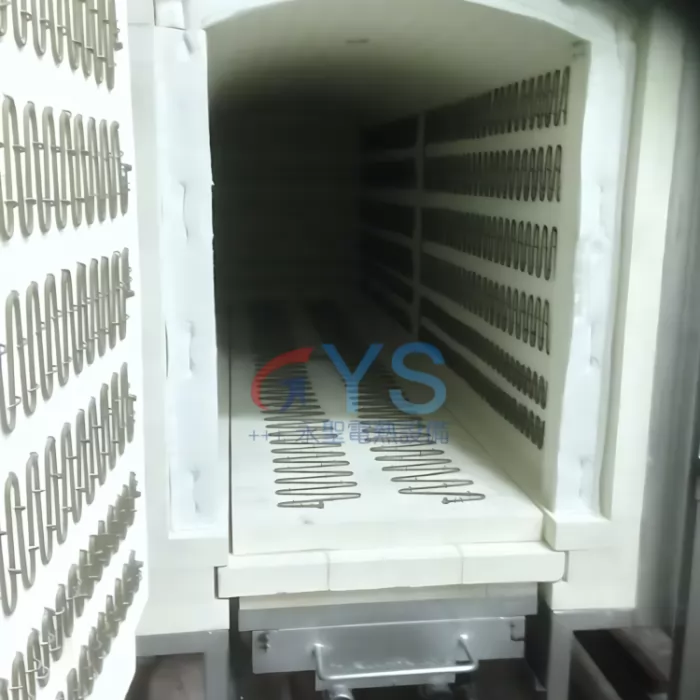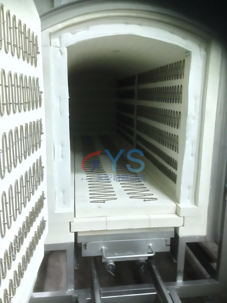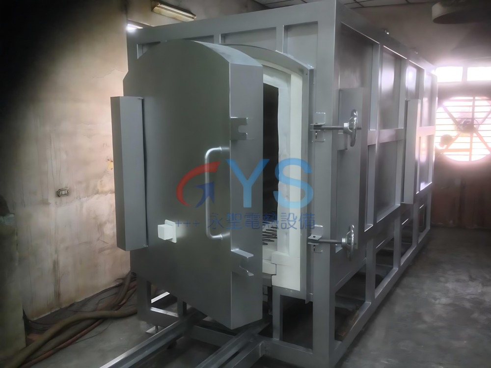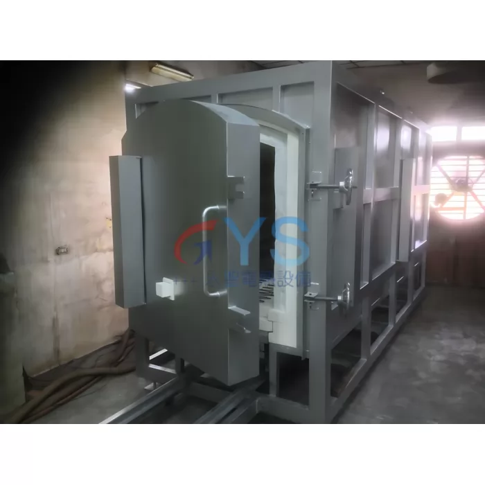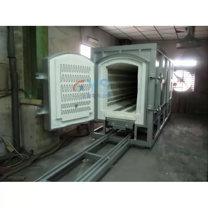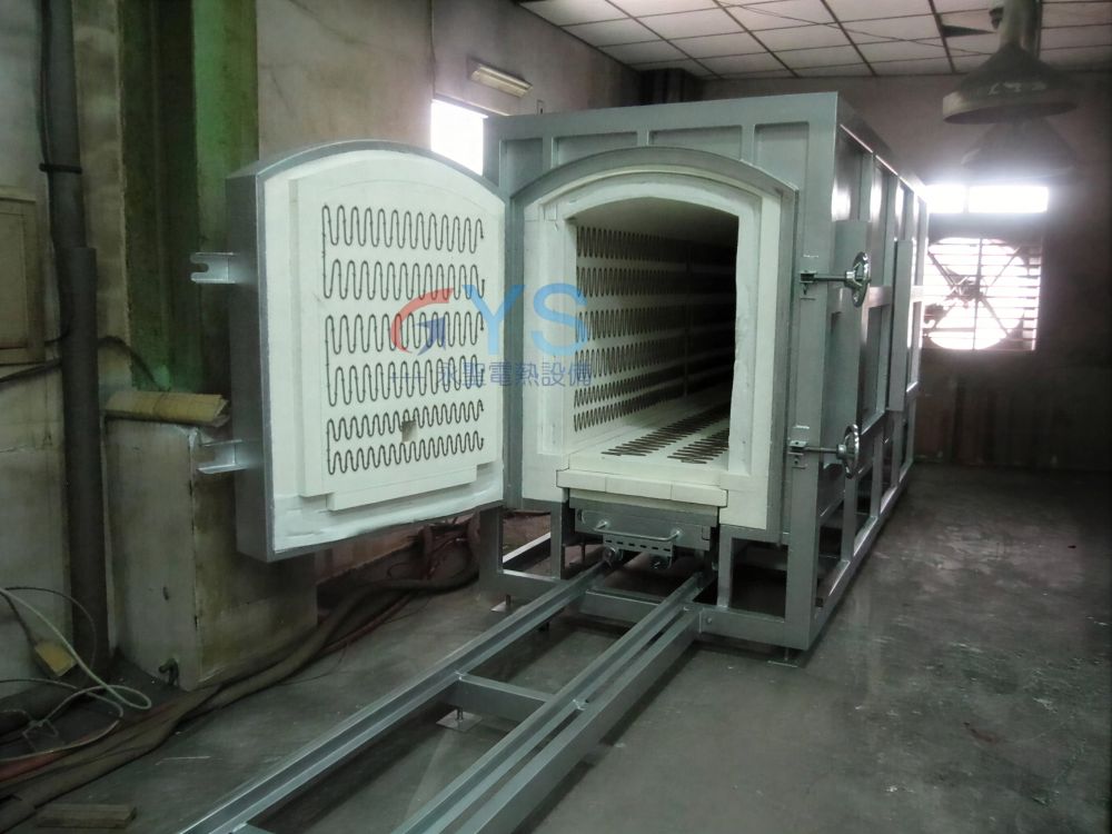 - 爐底為軌道式台車結構,可以乘載大型或重型工件,安全性高